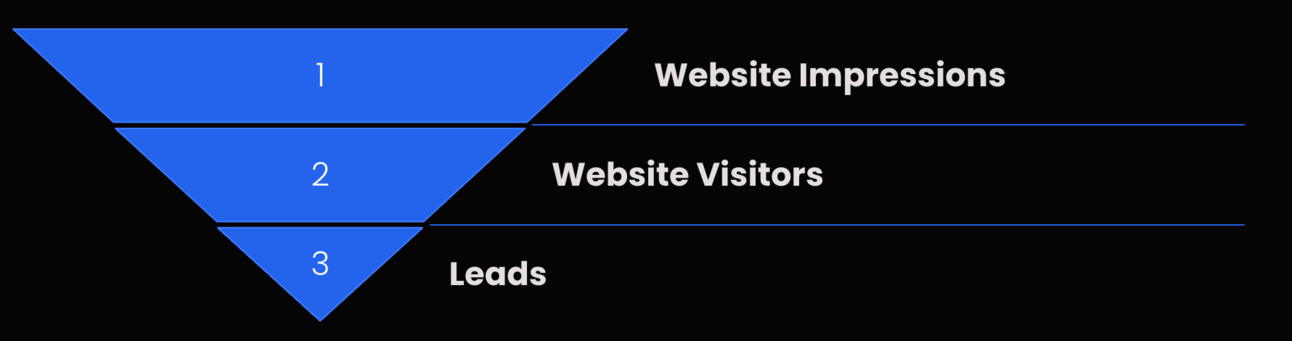 What you need to know: All marketing works as a funnel. It starts with impressions →, engaged visitors → leads, → customers, with each number getting smaller as it works through the funnel.